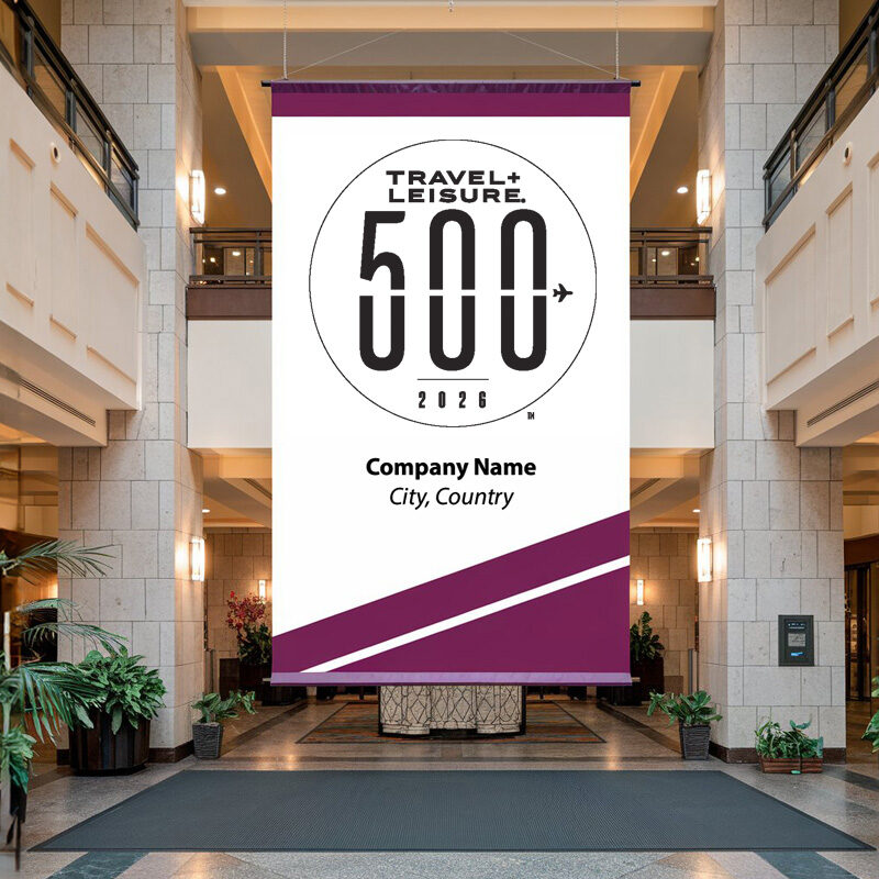 Our high-quality banners let you proudly display your Travel + Leisure recognition in style. Easy to hang, eye-catching, and perfect for any lobby or event space.