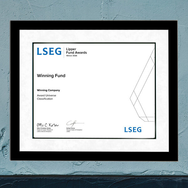 Your win entitles your firm to license the official LSEG Lipper Fund Award logo and refer to the win in advertising and marketing. A complimentary download of the official certificate commemorating your win is available and professionally produced plaques, framed prints and other merchandise may be available in your region. To manage the distribution, usage and integrity of the LSEG Lipper Fund Award logo and accolade, LSEG has partnered with PARS International Corp. to assist with your needs.